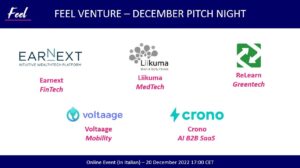 Riccardo Leonardi and Fabrizio Custorella are joining Feel Venture last event of 2022 together with other innovative selected startups: Voltaage, Earnext, LIIKUMA and Crono.