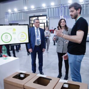Before getting on stage Riccardo met Francesca Bria – President of CDP Venture Capital – and introduced her to NANDO, the innovative product created by the ReLearn team that uses artificial intelligence to monitor and measure the waste produced in a place thanks to a smart sensor installed on the usual waste collection bins.